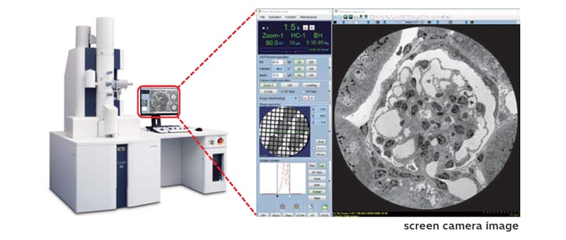 The HT7800 series offers a fully integrated workflow in one intuitive guided user interface. Both image navigation, using the wide field-of-view screen camera, and image acquisition, using the high-resolution camera, are carried out in one software platform. Digitalized operations also benefit remote applications, some of which include simultaneously sharing and exchanging captured TEM images at multiple points.