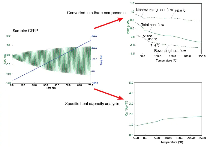 The reversing heat flow(e.g. glass transition) and non-reversing heat flow(e.g. enthalpy relaxation, curing, evaporation, decomposition) can be separately obtained from a single modulated DSC measurement, and it is useful when these transitions or reactions overlap. With NEXTA DSC, the modulated DSC method can also be used for determining the specific heat capacity.