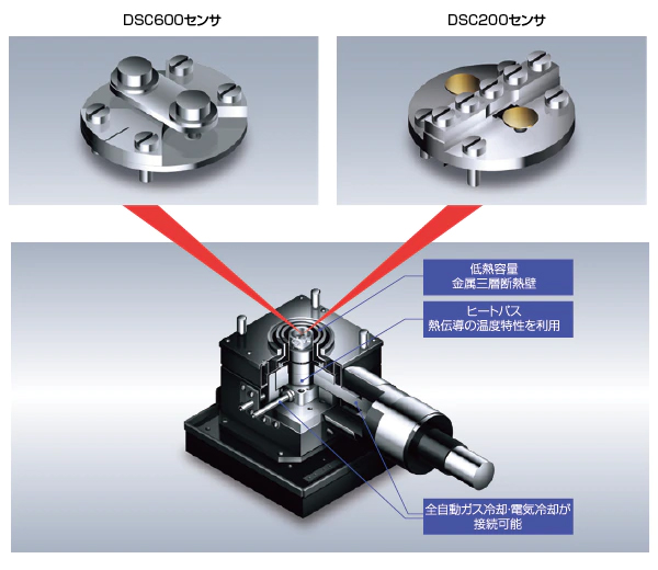 NEXTA DSC600では示差熱検出(DSC信号)の温度センサである熱電対を複数本直列に接続し多重化(サーモパイル)させた自社開発サーモパイル型DSCセンサを搭載することで、0.1μW以下という高感度を実現し、より少ない試料での測定が可能となりました。