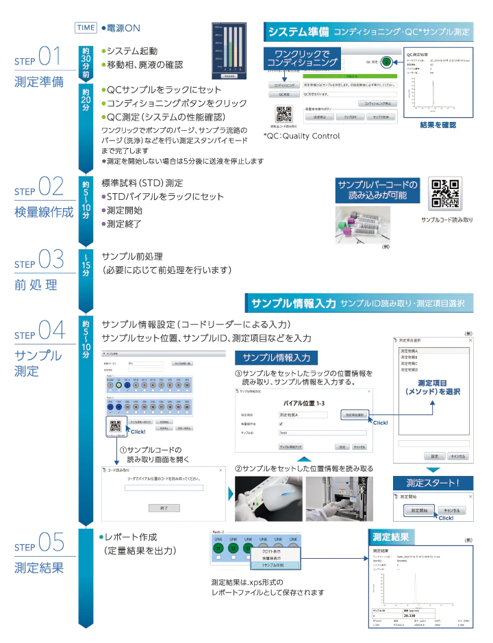 通常HPLC分析では、前処理や分析条件など適切な分析手順の確立が必要なため、専門知識や経験が求められます。また、正しい測定結果を取得するためには日常的に性能確認やメンテナンスを行う必要があります。LM1010高速液体クロマトグラフでは、分析前のコンディショニング、分析条件の設定、日常的な装置の性能確認などを自動で実施するソフトウェアを搭載することで、オペレーターの知識・経験に左右されることなく安定した測定結果を提供することが可能です。