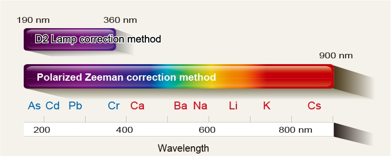 Background correction can be performed for elements that have absorption in the ultraviolet range or visible range. The polarized Zeeman correction method is one choice of correction method and has the advantage that it does not need to be selected for each element. It can also correct elements that cannot be corrected by the D2 lamp correction method, such as sodium and potassium.